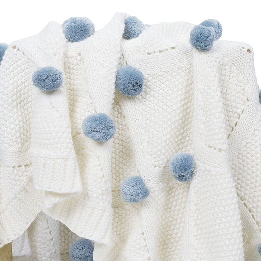 Whimsical Blue Pom Pom100% pure cotton knitted Summer/AC blanket for baby